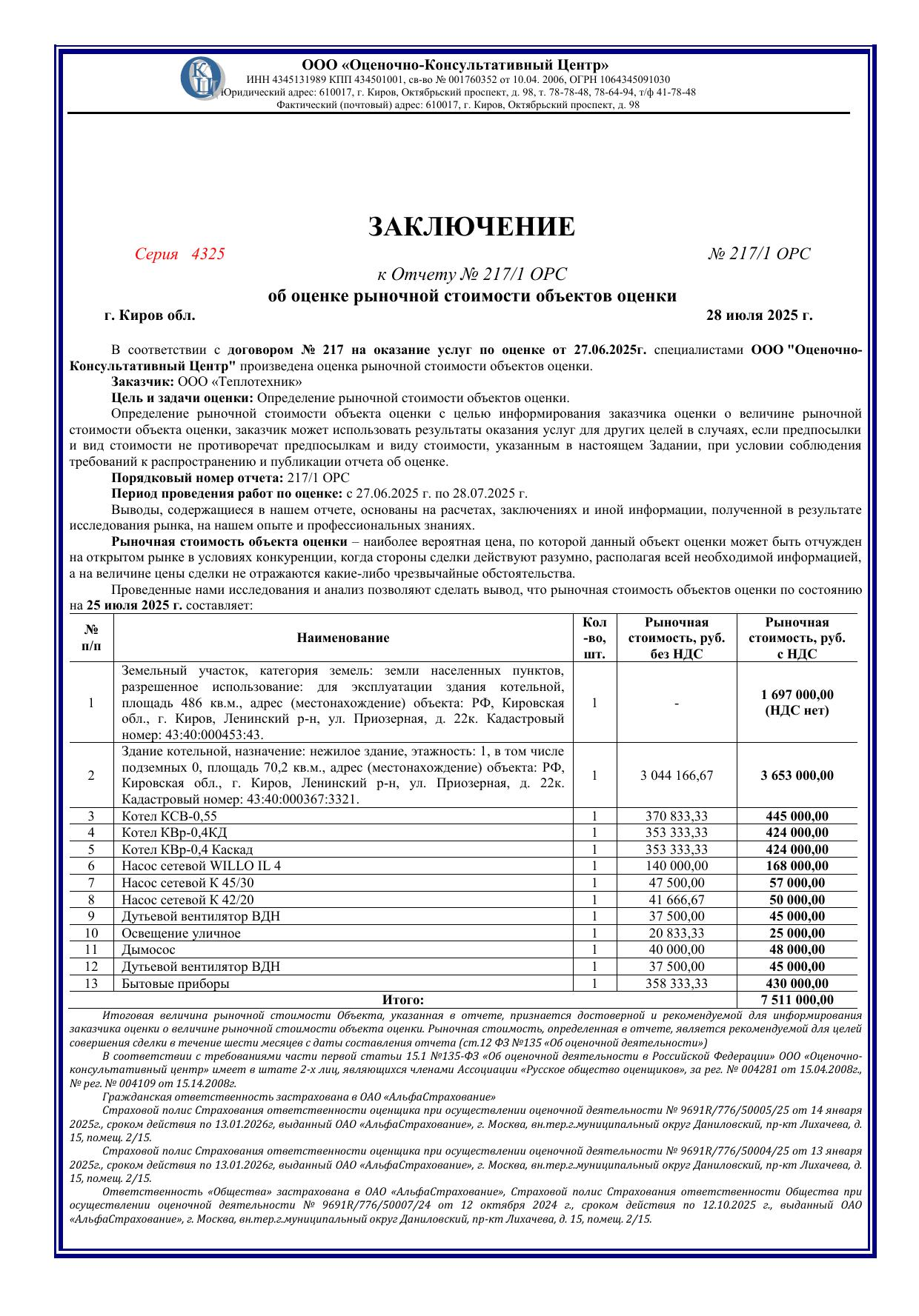 земельный участок, категория земель: земли населенных пунктов, разрешенное использование: для эксплуатации здания котельной, площадь 486 кв.м., адрес (местонахождение) объекта: РФ, Кировская обл., г. Киров, Ленинский р-н, ул. Приозерная, д. 22к. Кадастровый номер: 43:40:000453:43. – 1 шт.;