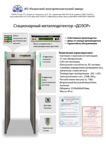 Металлодетектор "ДОЗОР" предназначен для обнаружения металлического оружия и крупных металлических предметов (нож, связка ключей), скрытых под одеждой человека при движении его через контролируемую зону