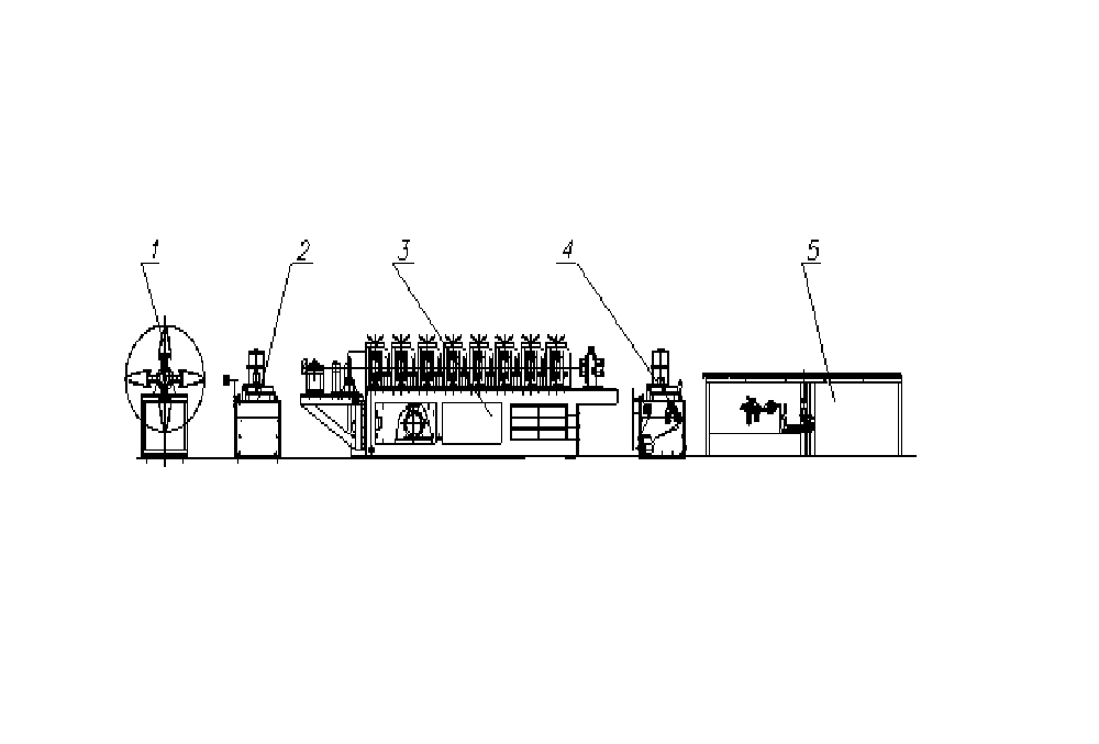 Предназначен для производства мелкосортного гнутого профиля гибкой-прокаткой (в том числе «методом интенсивного деформирования») из различной металлической ленты с σВ не более 390 МПа. На станине станка установлены правильное устройство и устройство для протирки и смазки ленты. Переход с проката одного вида профиля на другой осуществляется путем замены формующих роликов. Время переналадки – 1-2 часа.