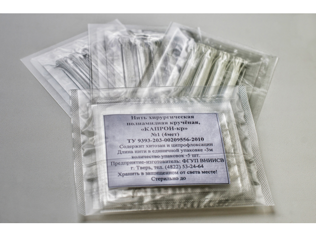 Хирургическая нить «КАПРОН» - полиамидная крученая или плетеная, окрашенная или неокрашенная, стерильная или нестерильная нить. Обладает высокой прочностью и эластичностью, надежно вяжется хирургическим узлом, вызывает умеренную реакцию.