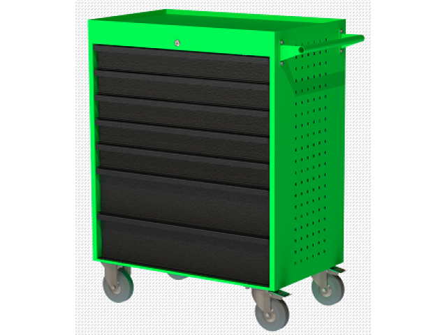 Инструментальная тележка ИТ-5-2 с 5-ю малыми выдвижными ящиками и 2-я большими выдвижными ящиками для инструмента, боковыми стенкой с перфорацией для установки дополнительного оснащения.
