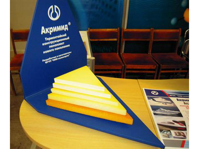 Акримид «А» - общего назначения. Товарная форма – плоские листы. Пенопласты «Акримид» обладают изотропной закрытоячеистой структурой, высокими прочностными параметрами и высокой термостойкостью (до 200-2200С), что дает возможность использовать их в различных технологиях склейки и ламинирования многослойных деталей и элементов радиоэлектроники и электротехники, авиационной техники: лопасти вертолетов, обтекатели авиационных двигателей, обшивка и отделка воздушных судов. Пенопласты «Акримид» являются радиопрозрачными