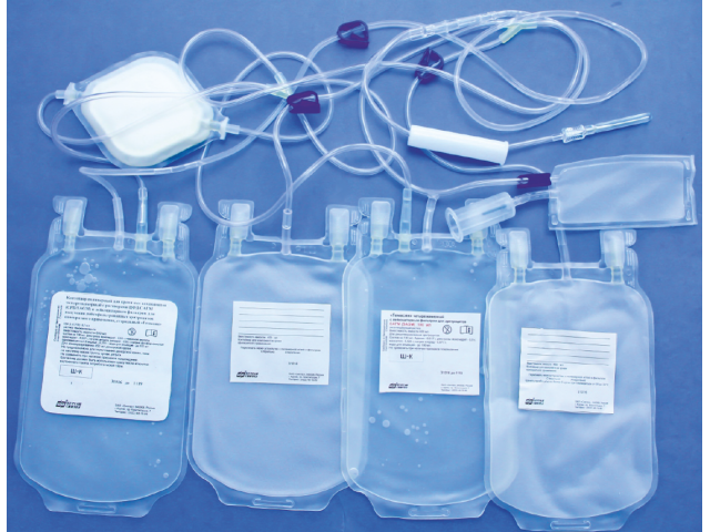 Контейнер укомплектован тонкостенной донорской иглой диаметром 1,65 мм с контролем «первого вскрытия», имеет протектор для защиты иглы, емкость для анализов и устройство для подключения вакуумной пробирки.
