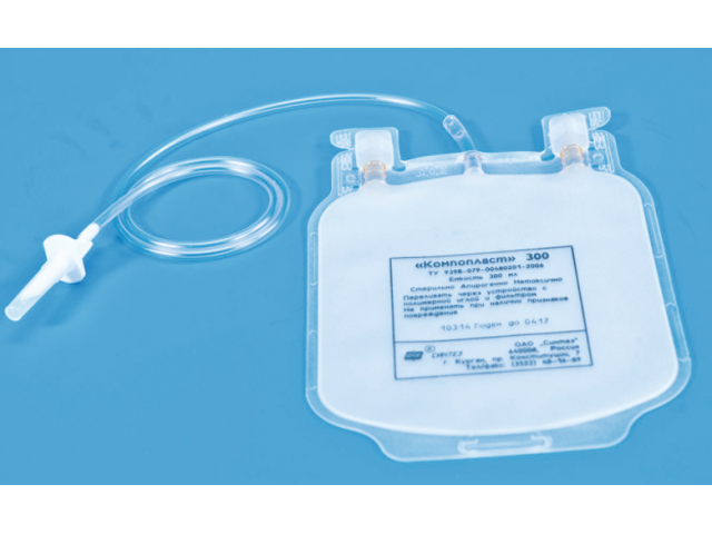 Контейнер полимерный однокамерный для компонентов крови с иглой полимерной однократного применения, стерильный «Компопласт» 300-«Синтез» предназначен для присоединения к контейнеру полимерному с консервированной кровью или плазмой для получения компонента крови, а также для его хранения, транспортирования и переливания.