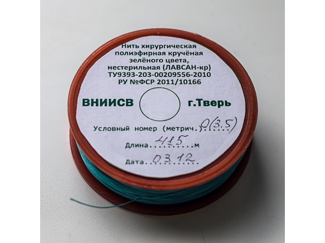 Нить полиэфирная (лавсан) хирургическая нерассасывающаяся зеленого цвета, крученая разрешена к применению и используется в качестве шовного хирургического материала с 1990 года.