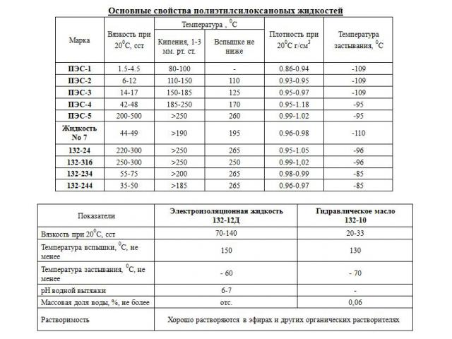 Основные свойства полиэтилсилоксановых жидкостей (см. фото).