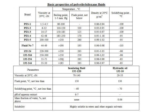 Специфическими особенностями полиэтилсилоксановых жидкостей являются их полная совместимость с минеральными и синтетическими маслами, отличные смазывающие свойства, низкая температура застывания (ниже -70°C) и инертность по отношению к конструкционным и функциональным материалам (металлы, сплавы, пластики, полимеры, резины и др.).
