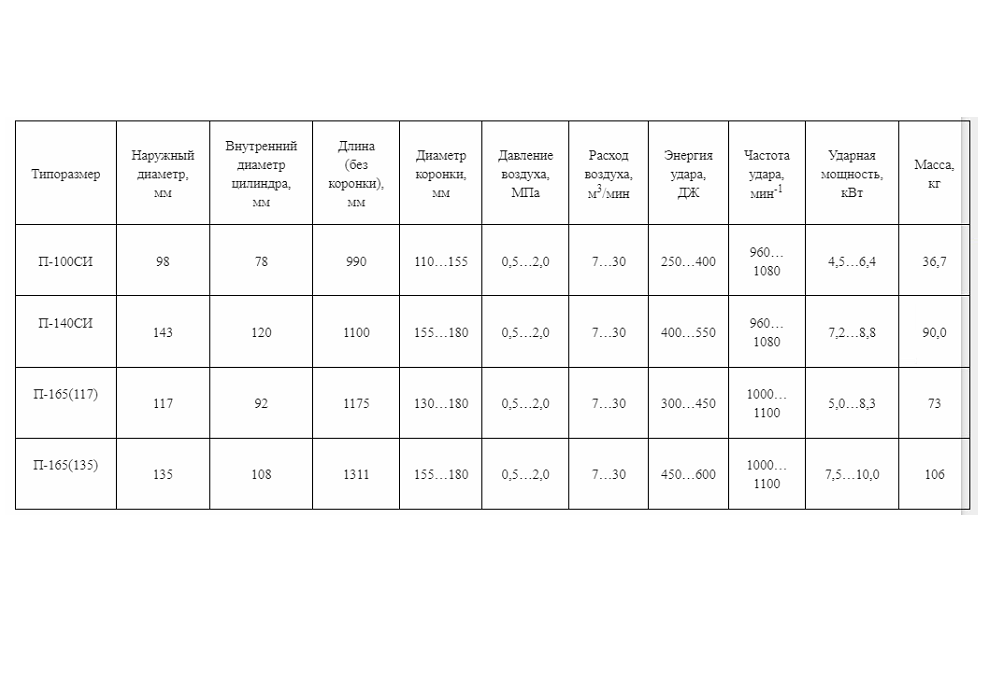 Погружные пневмоударники П-100СИ, П-140СИ, П-165(135), П-165(117) представляют собой бесклапанное устройство, которое сконструировано с учётом использования независимого вращения для бурения горных пород буровыми коронками. Погружные пневмоударникиП-100СИ, П-140СИ, П-165(135), П-165(117) рассчитаны для использования сжатого воздуха высокого давления до 2 МПа, что обеспечивает эффективное бурение при давлении воздуха 0,5 МПа и производительности кмпрессора от 7 до 30 м3/мин. Производительность пневмоударников определяется величиной рабочего давления воздуха, типом буровой установки и конкретными условиями бурения. Пневмоударники оснащены обратным клапаном, который предупреждает попадание воды в пневмоударник при отключении подачи сжатого воздуха. За счет использования сжатого воздуха высокого давления обеспечивается высокая скорость проходки, уменьшение времени бурения, эффективная очистка забоя от бурового шлама.