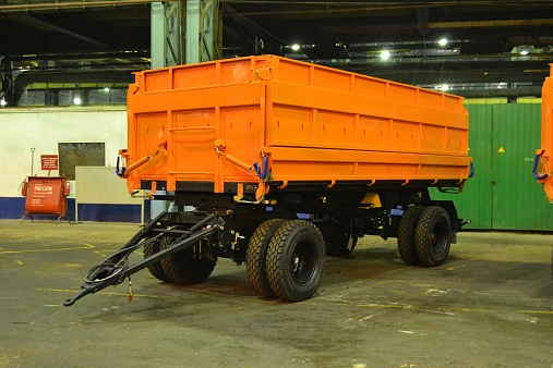 Двухосный самосвальный прицеп ТЗА-8551-02 предназначен для перевозки различных сельскохозяйственных грузов, в том числе минеральных удобрений, а также сыпучих строительных грузов. Объем платформы составляет 20 куб.м., разгрузка на 2 стороны. Подвеска рессорная, двускатная ошиновка (9.00R20).