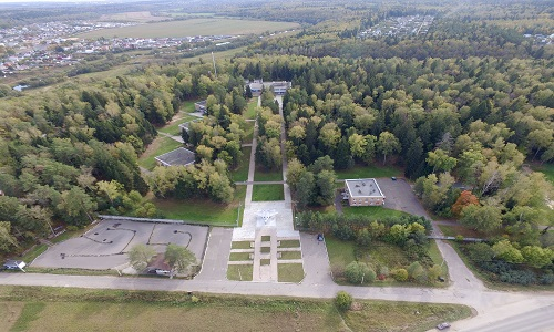 Перед объектом имеется автомобильная стоянка и полномасштабный макет сверхзвукового истребителя поколения СУ.