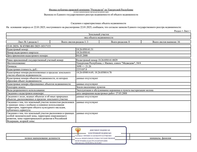 Земельный участок. Кадастровый номер: 18:26:050141:33. Виды разрешенного использования: Эксплуатация и обслуживание здания овощехранилища. Площадь: 3 000 +/- 19,17.