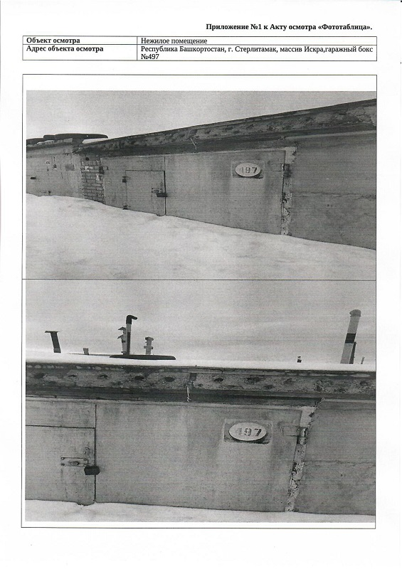 Нежилое помещение (гаражный бокс), общ. площ. 19,4 кв.м. Кадастровый номер: 02:56:000000:553. Адрес: Республика Башкортостан, г. Стерлитамак, массив: "Искра", гаражный бокс № 497