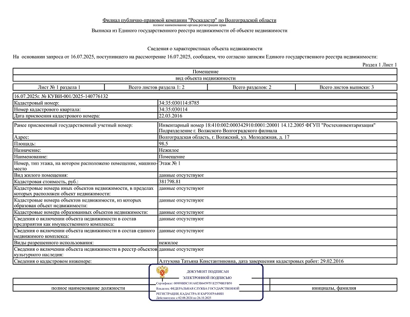 Нежилое помещение, общ. площ. 98,5 кв.м. Кадастровый номер: 34:35:030114:8785. Адрес: Волгоградская область, г. Волжский, ул. Молодежная, д. 17