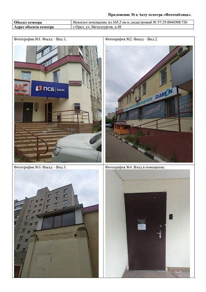 - Нежилое помещение, общ. площ. 165,20 кв.м., к/н: 57:25:0040308:726. Адрес: Орловская область, г. Орел, ул. Металлургов, д. 48, пом. 122
