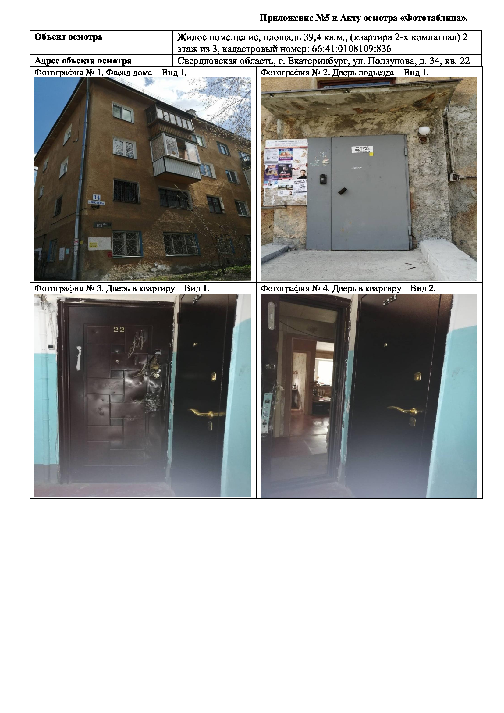 Адрес: Свердловская обл., г. Екатеринбург, ул. Ползунова, д. 34, кв. 22. Кадастровый номер: 66:41:0108109:836