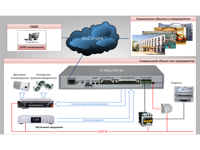 - формирование и передачу сигналов и информации оповещения по IP сети, с использованием сервиса VPN;