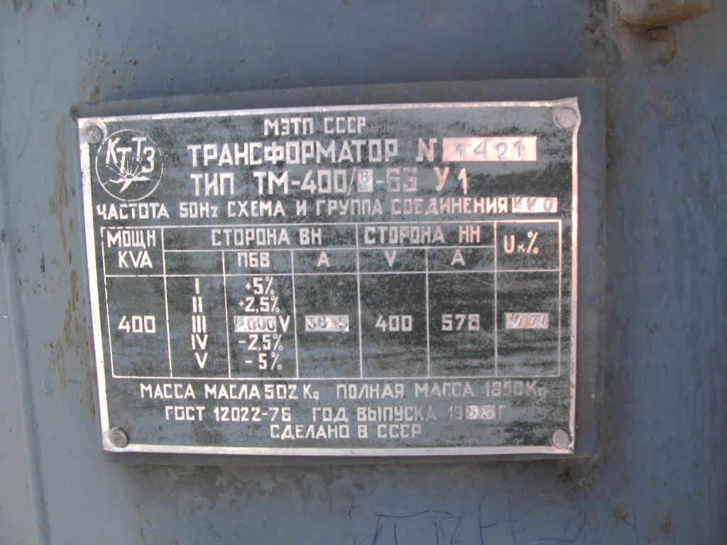 Силовой трансформатор ТМ 400 кВА, 1983 г.в., заводской № 1421.