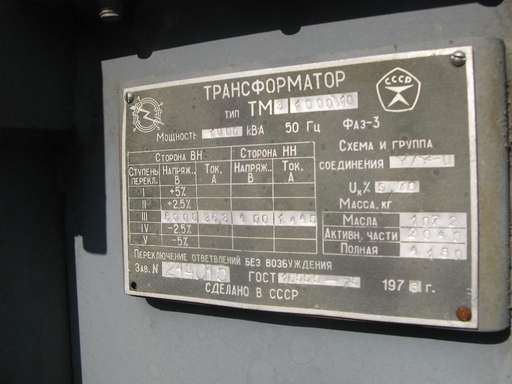 Силовой трансформатор ТМЗ 1000 кВА, 1978 г.в., заводской № 214015