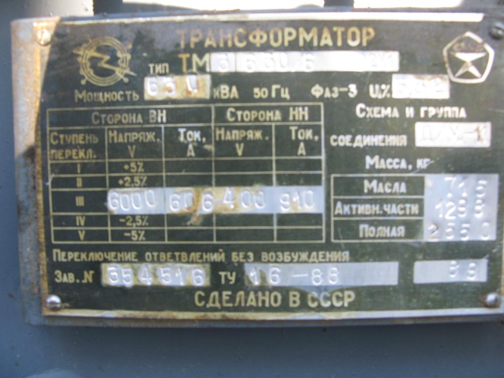 Силовой трансформатор ТМЗ 630 кВА, 1989 г.в., заводской № 354516