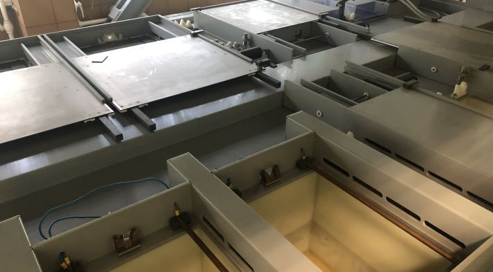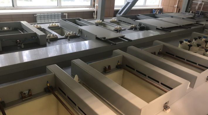 Установка предназначена для выполнения операций технологических процессов никелирования изделий электронной техники на подвесках в кассетах, мини барабанах и виброкорзинах. Установка представляет собой двухрядную линейку с рабочими позициями для выполнения пяти технологических маршрутов никелирования: — Матовое электрохимическое никелирование (сплав 29НК); — Матовое электрохимическое никелирование (сплав МД-40); — Блестящее электрохимическое никелирование (сплав 29НК); — Электрохимическое никелирование (сталь); — Химическое никелирование (медь, бронза, сталь). В составе установки: — ванны химической и электрохимической обработки; — ванны химической металлизации в термостатах; — ванны проточной и струйной промывки; — камеры сушки. Оснащение ванн: — системы нагрева и автоматического поддержания температуры; — системы циркуляции и фильтрации растворов; — рН — метры; — барботеры; — механизмы вертикального качания. Исполнение установки – двухсторонний вытяжной шкаф. Каждый ряд ванн в установке может обслуживаться вручную. Рабочие зоны оснащены подъемными защитными экранами. Вся конструкция футерована PVC-пластиком. Установка оснащена трехкоординатным X—Y—Z автооператором, обслуживающим все рабочие позиции в двух рядах. Автооператор выполнен герметичным, рамные конструкции изготовлены из композиционных материалов и титана. Автооператор снабжен сдвижным поддоном для сбора капель. Двухрядная компоновка позволила максимально компактно выполнить установку и уменьшить холостые пробеги автооператора в два раза. Движение автооператора по осям X и Y осуществляется одновременно. Обработка изделий ведется на подвесках или в кассетах, фторопластовых мини-барабанах и в виброкорзинах.