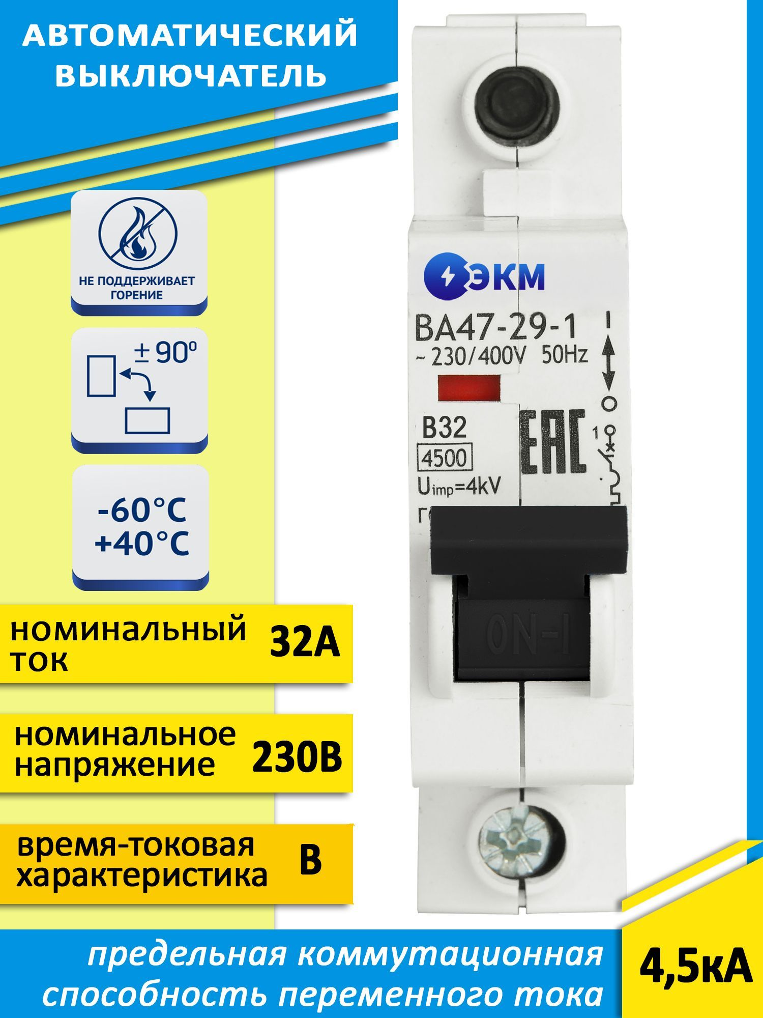 Завод ЭКМ представляет модульный автоматический однополюсный выключатель переменного тока с предельной коммутационной способностью при переменном токе 4.5 кА на номинальный ток 32А. Корпус выключателя выполнен из прочного пластика, обладающего стойкостью к воспламенению, степень защиты - IP 20. Время-токовая характеристика – С, порядок кратности номинальному току, при котором срабатывает расцепитель, 5-10*In. С такой характеристикой автоматы устанавливают в защите двигателя с не большими пусковыми токами, для освещения, в офисах, домах, квартирах, подсобных помещениях. Электрический пробка автомат 32ампер от производителя ЭКМ - это надежное устройство для обеспечения безопасности и стабильного электроснабжения в вашем доме. Этот однофазный автомат является эталоном качества, предоставляя надежную защиту от перегрузок и короткого замыкания.<br/><br/>С механическим переключателем и однополюсной конструкцией, этот автоматический выключатель обеспечивает эффективное управление электрическими нагрузками и защиту вашего электрооборудования от повреждений. Он также может использоваться в качестве предохранителя для защиты системы питания и выключения массы. Установка этого электрического устройства обеспечивает надежное и стабильное электропитание вашего дома, предотвращая возможные аварийные ситуации. Совместим со всеми видами щетчиков, вводных автоматов, ВДТ, АВДТ И УЗО.<br/><br/>Безопасность вашего электрического оборудования - наш приоритет. Наш автоматический рубильник с номинальным током 32А и одним полюсом обеспечивает надежную защиту от перегрузок и коротких замыканий.<br/><br/>Является Российским аналогом таких брендов как: EKF BASIC, DEKraft, IEK, Schneider Electric, Legrand, ABB.<br/><br/>В нашем магазине "Центр Энергии" вы можете ознакомиться с широким ассортиментом электро товаров на любой вкус - узо, дифф автоматы, электровыключатели, прочие автоматы для электрики, а так же большой выбор щитов электрических в сборе.