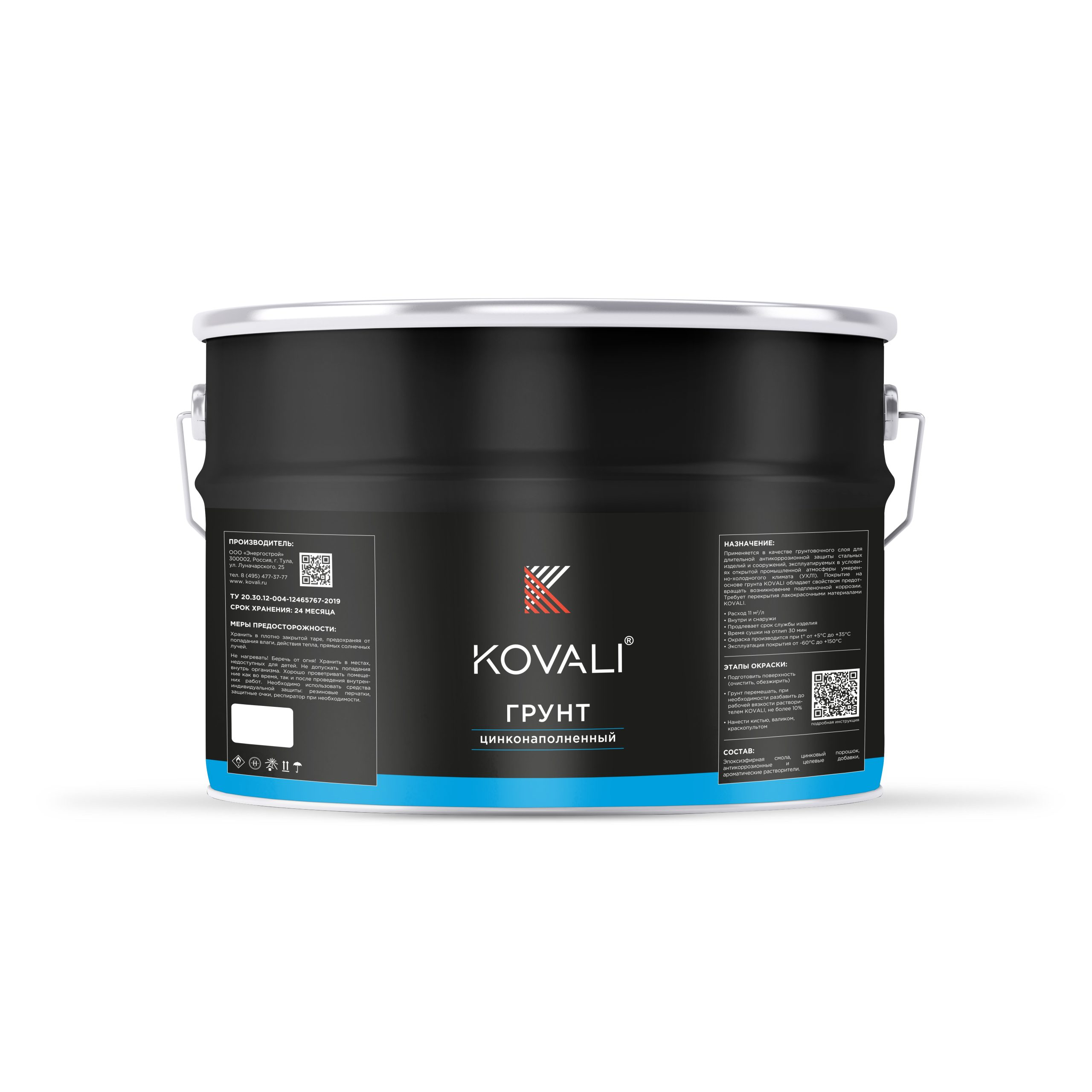 Цинконаполненный грунт KOVALI® представляет собой суспензиювысокодисперсного порошка цинка и наполнителей в растворе эпоксиэфирной смолы и органических растворителей с введением целевых добавок . Цинконаполненный грунт KOVALI® предназначен для длительнойантикоррозионной защиты стальных изделий и сооружений, эксплуатируемых в условиях открытой промышленной атмосферы умеренно-холодного климата (УХЛ1) . Покрытие на его основе обладает свойством предотвращать возникновение подпленочной коррозии. Цинконаполненный грунт KOVALI® может применяться в качестве грунта подпокрывные материалы в комплексных системах защиты . Срок службы системы покрытия, состоящей из Цинконаполненного грунта KOVALI® (60 мкм) и полиуретановой эмалиKOVALI® ( 100 мкм) , при эксплуатации в условиях открытой промышленной атмосферыумеренно-холодного климата (УХЛ1) составляет не менее 15 лет. Рекомендуемые для покрывного эмали и композиции всей линейки "KOVALI®" (грунт-эмаль полуглянец и матовая, полиуретановая краска, термостойкая краска и др.)