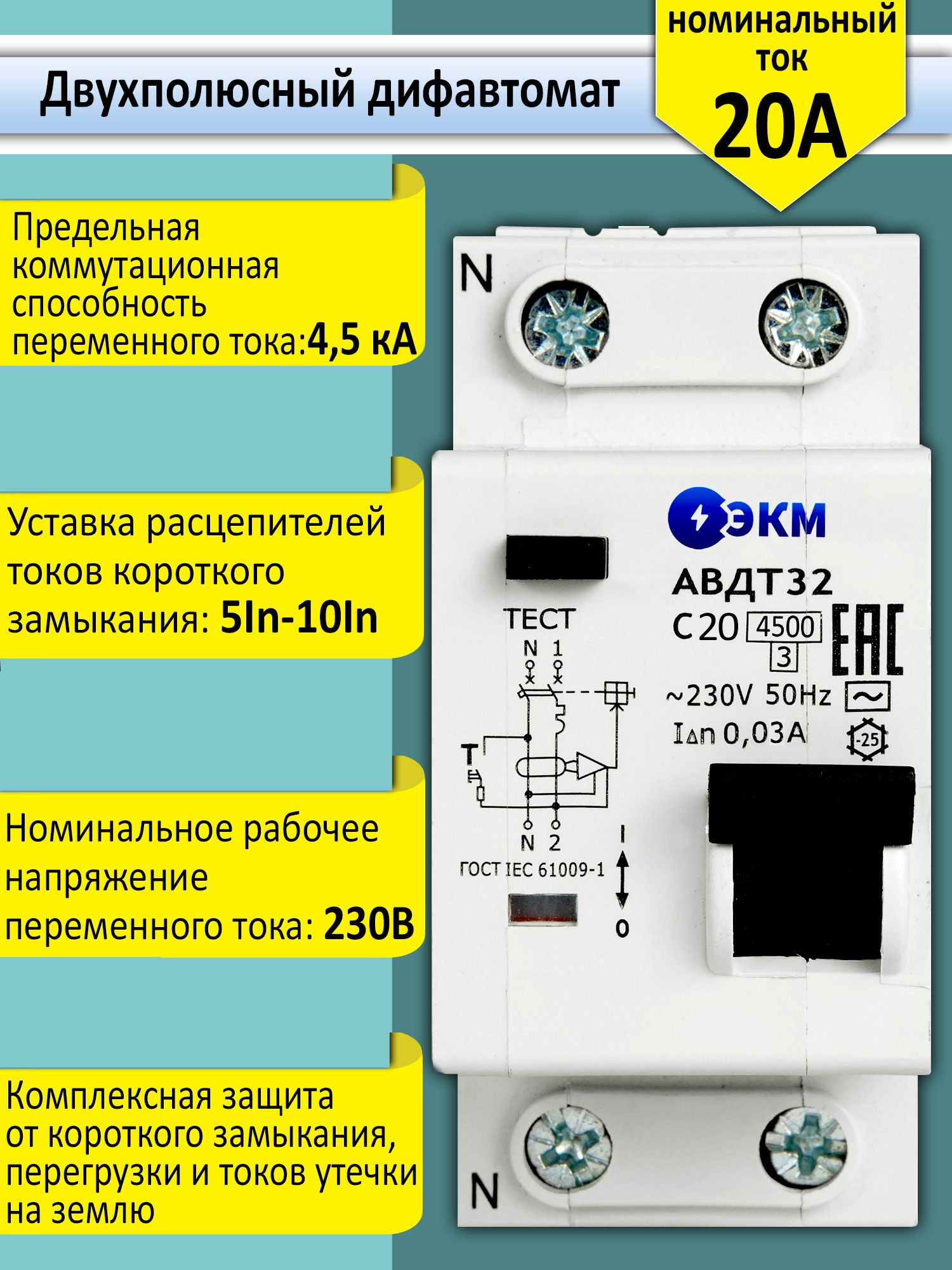 АВДТ32-22C20-AC-УХЛ4 ЭКМ - автоматический выключатель дифференциального тока на номинальный ток 16А и номинальный отключающий дифференциальный ток 30 мА. Двухполюсный дифференциальный автоматический выключатель - это коммутационный аппарат, служащий для защиты человека от поражения током при контакте с токопроводящими частями электрических установок, а также для предотвращения пожаров из-за протекания токов на землю.