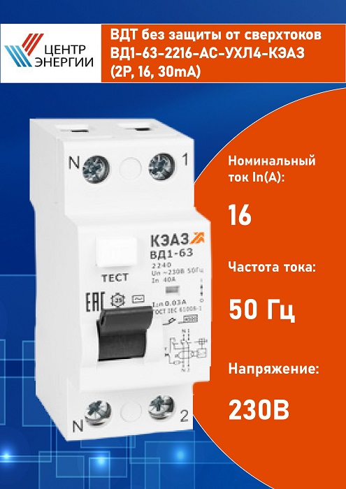 KEAZ ВДТ без защиты от сверхтоков ВД1-63-2216-АС-УХЛ4 (2P, 16, 30mA) электронное-КЭАЗ