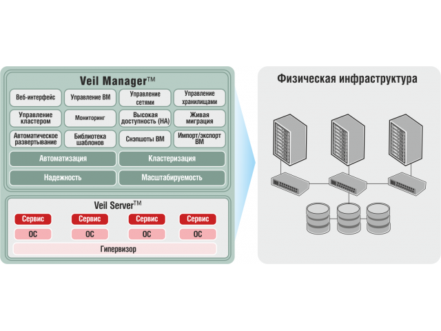 ECP Veil™ предназначена для создания виртуализованной инфраструктуры на базе универсальных серверных платформ с архитектурой x86-64, позволяя централизованно управлять всей ИТ-инфраструктурой предприятия с помощью дружественного веб-интерфейса Veil UI™, который обеспечивает удобную и понятную визуализацию виртуального пространства и мониторинг загрузок всех подсистем (CPU, Mem, Disk, Network).