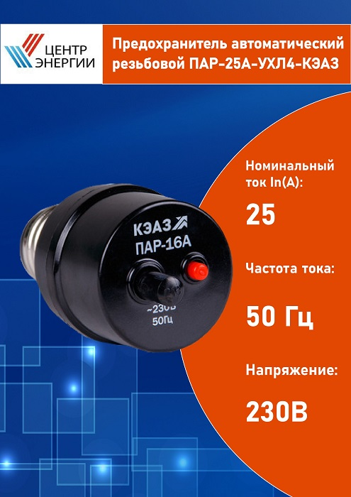Контактор Предохранитель автоматический резьбовой ПАР-25А-УХЛ4-КЭАЗ: надежное электротехническое устройство.