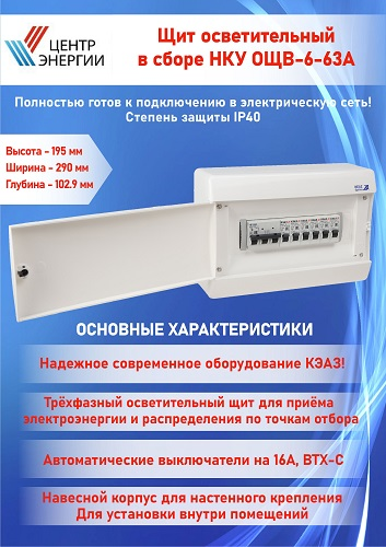 Трехфазный щит освещения осуществляет защиту выходящих линий от замыканий и токовых и токовых перегрузок. Предназначен для распределения электроэнергии в вашем доме, квартире или офисе. Наша компания предлагает широкий выбор электрических щитов и шкафов различных типов и конфигураций с дверками и без.<br/><br/>Мы предлагаем электрические щитки из пластикового или металлического корпуса, встраиваемые или навесные, модульные или уличные. В нашем ассортименте вы найдете электрощитки с различным количеством розеток, автоматов, рейок, рядов и модулей для учета электроэнергии.<br/><br/>Наши электрические щиты оснащены счетчиками, предохранителями, УЗО, таймерами и другими необходимыми приборами для безопасной эксплуатации электрооборудования. Монтаж электрического короба производится профессионалами с учетом всех стандартов и требований.<br/><br/>Не рискуйте своей безопасностью и безопасностью вашего дома – выбирайте надежные и качественные электрические шкафчики от нашей компании. Обеспечьте надежное электроснабжение и защиту от перегрузок и коротких замыканий с нашими продуктами.<br/><br/>Электрический блок бокс - надежный и эффективный способ обеспечить безопасность вашего дома или офиса. КЭАЗ предлагает широкий выбор электрических щитов различных типов: от уличных до встроенных и настенных выключателей. <br/><br/>Наши электрические щиты изготовлены из качественных материалов, обеспечивая надежное хранение электроники и электрооборудования. Коробки и ящики наших щитов обладают прочной конструкцией, защищающей от перегрева и коротких замыканий. <br/><br/>Кроме того, встроенные распределительные шины обеспечивают эффективное распределение электроэнергии по всему дому. Наши электрические щиты идеально подходят как для домашнего использования, так и для коммерческих целей.<br/><br/>Обеспечьте безопасность и надежность электроснабжения с нашими электрическими щитами. Сделайте правильный выбор в пользу качества и надежности!<br/><br/>Состав щита: корпус пластиковый навесной на 12 модулей; вводной трехполюсный автомат на 63А - 1шт.; однополюсный автомат на 16А (ВТХ-С) - 6 шт.; шина нулевая, шина заземления
