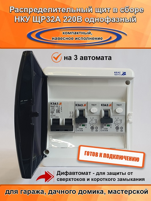 Щит распределительный в сборе НКУ ЩР32А-UNK-06 электрощиток для дачи, гаража, мастерской (1Х2С32, 2хАВДТ-22С16) пп9