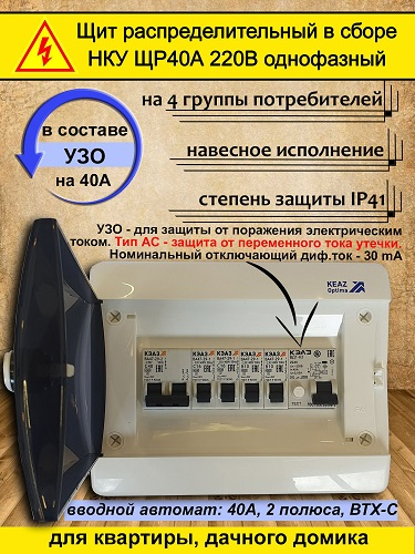 Щит распределительный в сборе НКУ ЩР40А-UNK-08 электрощиток для квартиры, дачи, гаража (2С40, 2х1С16,2х1В10,УЗО2240) пп37