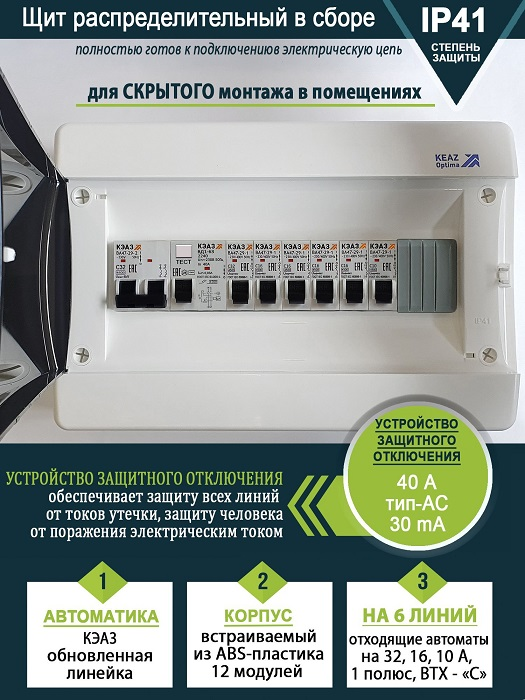 Однофазный электрощит на 6 линий рассчитан на нагрузку до 7кВт, полностью готов к подключению электроэнергии в вашем доме, квартире или офисе. Наша компания предлагает широкий выбор электрических щитов и шкафов различных типов и конфигураций с дверками и без.<br/><br/>Мы предлагаем электрические щитки из пластикового или металлического корпуса, встраиваемые или навесные, модульные или уличные. В нашем ассортименте вы найдете электрощитки с различным количеством розеток, автоматов, рейок, рядов и модулей для учета электроэнергии.<br/><br/>Наши электрические щиты оснащены счетчиками, предохранителями, УЗО, таймерами и другими необходимыми приборами для безопасной эксплуатации электрооборудования. Монтаж электрического короба производится профессионалами с учетом всех стандартов и требований.<br/><br/>Не рискуйте своей безопасностью и безопасностью вашего дома – выбирайте надежные и качественные электрические шкафчики от нашей компании. Обеспечьте надежное электроснабжение и защиту от перегрузок и коротких замыканий с нашими продуктами.<br/><br/>Электрический блок бокс - надежный и эффективный способ обеспечить безопасность вашего дома или офиса. КЭАЗ предлагает широкий выбор электрических щитов различных типов: от уличных до встроенных и настенных выключателей.<br/><br/>Наши электрические щиты изготовлены из качественных материалов, обеспечивая надежное хранение электроники и электрооборудования. Коробки и ящики наших щитов обладают прочной конструкцией, защищающей от перегрева и коротких замыканий.<br/><br/>Кроме того, встроенные распределительные шины обеспечивают эффективное распределение электроэнергии по всему дому. Наши электрические щиты идеально подходят как для домашнего использования, так и для коммерческих целей.<br/><br/>Обеспечьте безопасность и надежность электроснабжения с нашими электрическими щитами. Сделайте правильный выбор в пользу качества и надежности!<br/><br/>Состав щита:<br/><br/>корпус пластиковый встраиваемый на 12 модулей (прозрачная дверца);<br/><br/>вводной двухполюсный автомат на 32А - 1шт.;<br/><br/>однополюсный автомат на 10А (ВТХ-С) - 1 шт. (освещение);<br/><br/>однополюсный автомат на 16А (ВТХ-С) - 4 шт.(духовой шкаф, холодильник, стиральная машина, розетки);<br/><br/>однополюсный автомат на 32А (ВТХ-С) - 1 шт. (варочная панель);<br/><br/>УЗО на 40А (тип АС, 30mA) - 1 шт.;<br/><br/>шина нулевая, шина заземления;