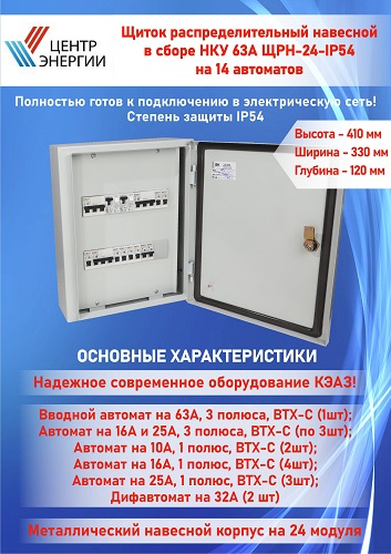 Трехфазный электрощит НКУ 63А-ЩРН-24-IP54 рассчитан на 13 групп потребителей, полностью готов к подключению электроэнергии в вашем доме, квартире или офисе. Наша компания предлагает широкий выбор электрических щитов и шкафов различных типов и конфигураций с дверками и без.