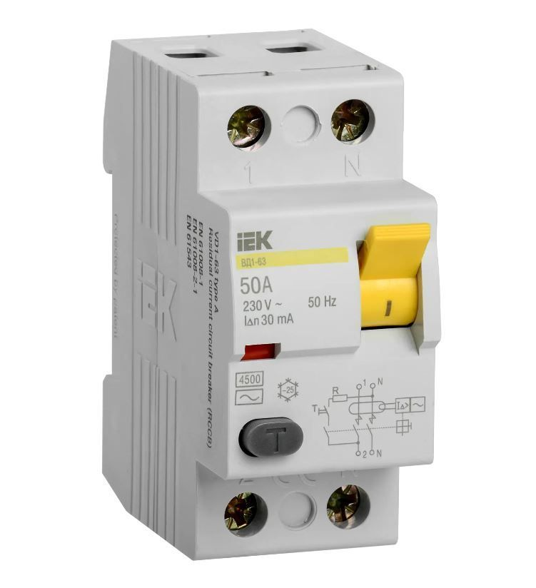 Устройство защитного отключения УЗО IEK ВД1-63 на 50А, 2 полюса, тип АС, 30mA