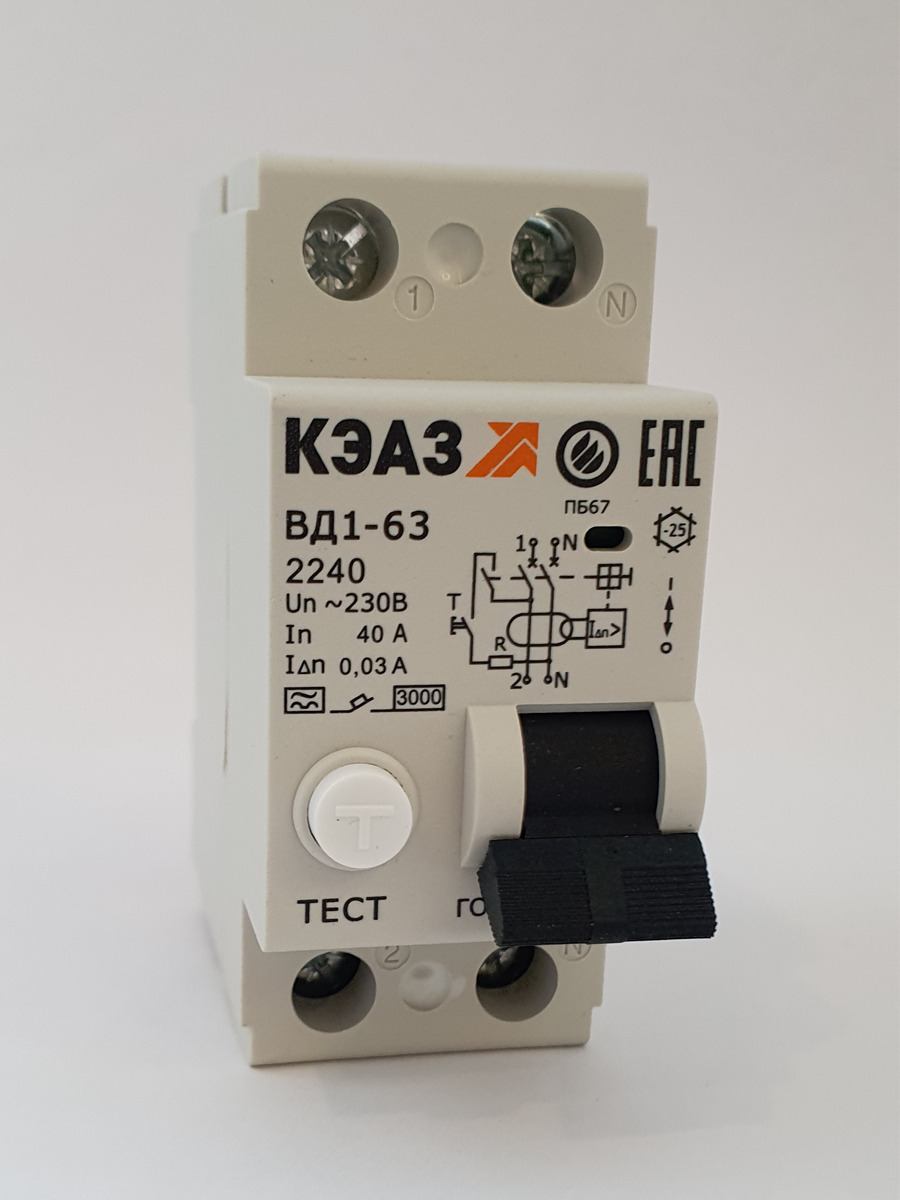 Однофазное устройство защитного отключения ВД1-63-2240-А на номинальный ток 40А предназначено для применения в электрических сетях переменного тока с частотой 50Гц и рабочим напряжением 230В для защиты людей от поражения электрическим током при неисправностях электрооборудования или при непреднамеренном контакте с открытыми проводящими частями электроустановок, а также для предотвращения возгораний и пожаров, возникающих вследствие протекания токов утечки и замыканий на землю. Устройство защитного отключения ВД1-63-2240-А реагирует на возникающие внезапно или медленно возрастающие переменный дифференциальный ток и пульсирующий постоянный ток. Это приборы, в которых используются выпрямители и импульсные блоки питания: компьютеры, стиральные машинки, телевизоры, посудомойки, микроволновки. УЗО срабатывает при токе утечки 30мА. Электромеханическая схема УЗО обеспечивает надежную защиту жизни человека и имущества от пожара даже при обрыве нулевого проводника.