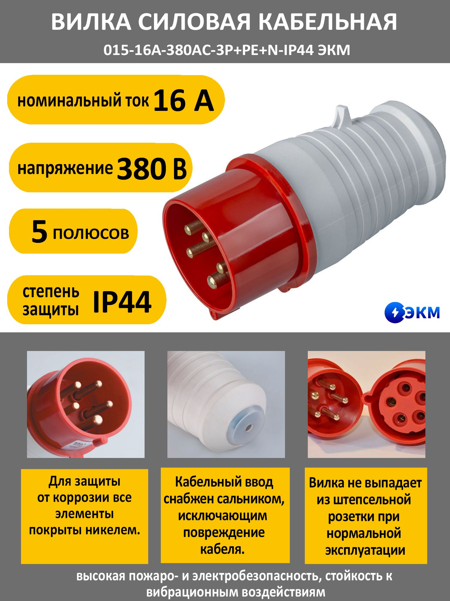 Разъемы силовые предназначены для эксплуатации внутри помещений и на открытом воздухе совместно с мобильным электрооборудованием с кабельной системой питания и стационарным электрооборудованием однофазного и трехфазного исполнения. Подходят для подключения строительного электрооборудования и электроинструмента, станков и другого промышленного оборудования, для электроснабжения бытовок и киосков, для использования в гостиницах, домах отдыха, турбазах и т.д. Штыревые контакты вилки изготовлены из электротехнической латуни. Для защиты от коррозии все элементы покрыты никелем. Вилка силовая не выпадает из штепсельной розетки при нормальной эксплуатации. Степень защиты IP44 позволяет эксплуатировать устройство во влажной и загрязненной пылью среде. Корпус и изолирующие детали и выполнены из термостойкого материала, не поддерживающего горение. С помощью переносного разъема разъем - вилка кабельная - удобно организовывать временное электропитание различного оборудования, например, на строительных площадках. Переносные вилки монтируются на кабель.
