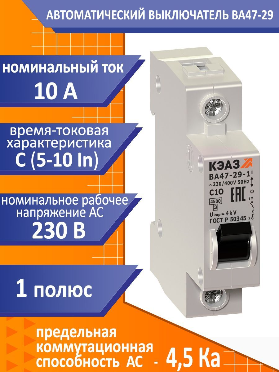 Завод КЭАЗ представляет модульный автоматический однополюсный выключатель переменного тока с предельной коммутационной способностью при переменном токе 4.5 кА на номинальный ток 10А. Корпус выключателя выполнен из прочного пластика, обладающего стойкостью к воспламенению, степень защиты - IP 20. Время-токовая характеристика – С, порядок кратности номинальному току, при котором срабатывает расцепитель, 5-10*In. С такой характеристикой автоматы устанавливают в защите двигателя с не большими пусковыми токами, для освещения, в офисах, домах, квартирах, подсобных помещениях. Электрический пробка автомат 10ампер от производителя КЭАЗ - это надежное устройство для обеспечения безопасности и стабильного электроснабжения в вашем доме. Этот однофазный автомат является эталоном качества, предоставляя надежную защиту от перегрузок и короткого замыкания.