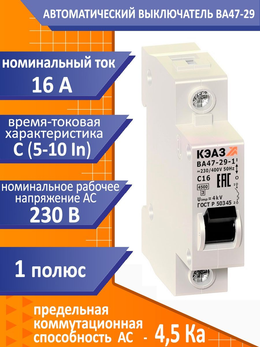 Завод КЭАЗ представляет модульный автоматический однополюсный выключатель переменного тока с предельной коммутационной способностью при переменном токе 4.5 кА на номинальный ток 16А. Корпус выключателя выполнен из прочного пластика, обладающего стойкостью к воспламенению, степень защиты - IP 20. Время-токовая характеристика – С, порядок кратности номинальному току, при котором срабатывает расцепитель, 5-10*In. С такой характеристикой автоматы устанавливают в защите двигателя с не большими пусковыми токами, для освещения, в офисах, домах, квартирах, подсобных помещениях. Электрический пробка автомат 16ампер от производителя КЭАЗ - это надежное устройство для обеспечения безопасности и стабильного электроснабжения в вашем доме. Этот однофазный автомат является эталоном качества, предоставляя надежную защиту от перегрузок и короткого замыкания.