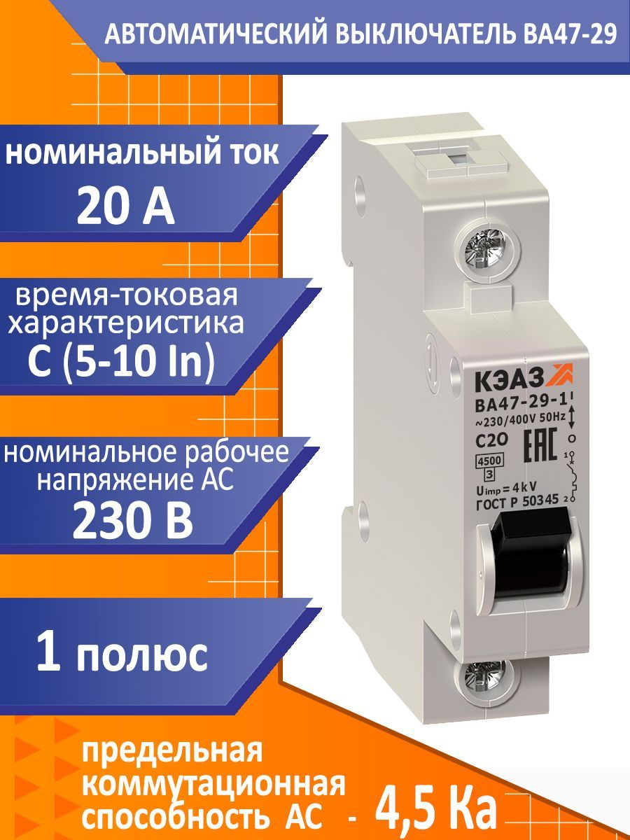Завод КЭАЗ представляет модульный автоматический однополюсный выключатель переменного тока с предельной коммутационной способностью при переменном токе 4.5 кА на номинальный ток 20А. Корпус выключателя выполнен из прочного пластика, обладающего стойкостью к воспламенению, степень защиты - IP 20. Время-токовая характеристика – С, порядок кратности номинальному току, при котором срабатывает расцепитель, 5-10*In. С такой характеристикой автоматы устанавливают в защите двигателя с не большими пусковыми токами, для освещения, в офисах, домах, квартирах, подсобных помещениях. Электрический пробка автомат 20ампер от производителя КЭАЗ - это надежное устройство для обеспечения безопасности и стабильного электроснабжения в вашем доме. Этот однофазный автомат является эталоном качества, предоставляя надежную защиту от перегрузок и короткого замыкания.