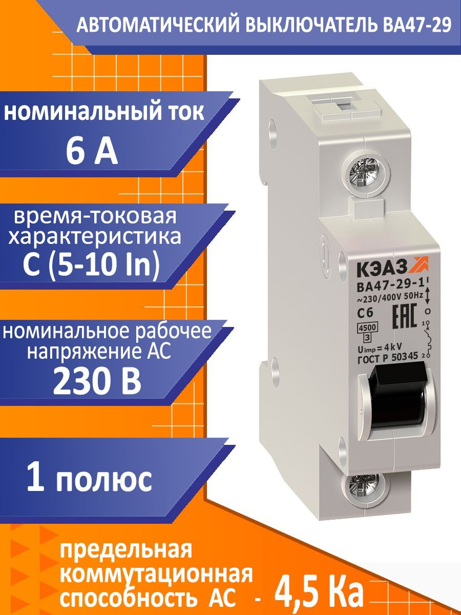 Завод КЭАЗ представляет модульный автоматический однополюсный выключатель переменного тока с предельной коммутационной способностью при переменном токе 4.5 кА на номинальный ток 6А. Корпус выключателя выполнен из прочного пластика, обладающего стойкостью к воспламенению, степень защиты - IP 20. Время-токовая характеристика – С, порядок кратности номинальному току, при котором срабатывает расцепитель, 5-10*In. С такой характеристикой автоматы устанавливают в защите двигателя с не большими пусковыми токами, для освещения, в офисах, домах, квартирах, подсобных помещениях. Электрический пробка автомат 6ампер от производителя КЭАЗ - это надежное устройство для обеспечения безопасности и стабильного электроснабжения в вашем доме. Этот однофазный автомат является эталоном качества, предоставляя надежную защиту от перегрузок и короткого замыкания.
