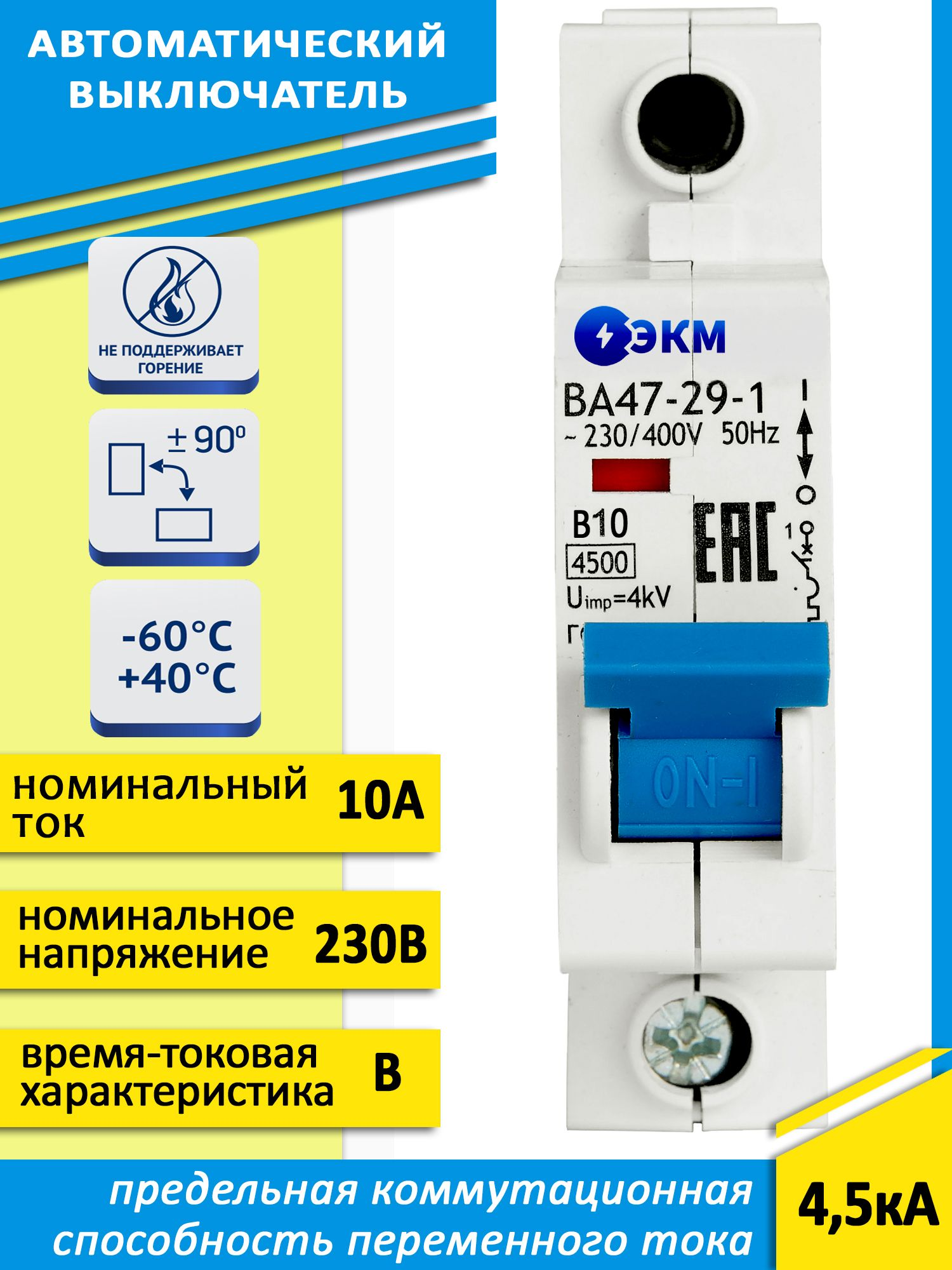 Завод ЭКМ представляет модульный автоматический однополюсный выключатель переменного тока с предельной коммутационной способностью при переменном токе 4.5 кА на номинальный ток 10А. Корпус выключателя выполнен из прочного пластика, обладающего стойкостью к воспламенению, степень защиты - IP 20. Время-токовая характеристика – С, порядок кратности номинальному току, при котором срабатывает расцепитель, 5-10*In. С такой характеристикой автоматы устанавливают в защите двигателя с не большими пусковыми токами, для освещения, в офисах, домах, квартирах, подсобных помещениях. Электрический пробка автомат 10ампер от производителя ЭКМ - это надежное устройство для обеспечения безопасности и стабильного электроснабжения в вашем доме. Этот однофазный автомат является эталоном качества, предоставляя надежную защиту от перегрузок и короткого замыкания.