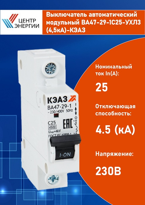 Завод КЭАЗ представляет модульный автоматический однополюсный выключатель переменного тока с предельной коммутационной способностью при переменном токе 4.5 кА на номинальный ток 25А. Корпус выключателя выполнен из прочного пластика, обладающего стойкостью к воспламенению, степень защиты - IP 20. Время-токовая характеристика – С, порядок кратности номинальному току, при котором срабатывает расцепитель, 5-10*In. С такой характеристикой автоматы устанавливают в защите двигателя с не большими пусковыми токами, для освещения, в офисах, домах, квартирах, подсобных помещениях. Электрический пробка автомат 25ампер от производителя КЭАЗ - это надежное устройство для обеспечения безопасности и стабильного электроснабжения в вашем доме. Этот однофазный автомат является эталоном качества, предоставляя надежную защиту от перегрузок и короткого замыкания.