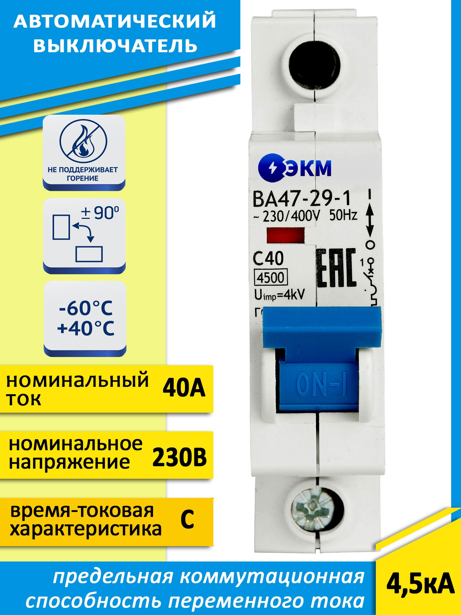 Завод ЭКМ представляет модульный автоматический однополюсный выключатель переменного тока с предельной коммутационной способностью при переменном токе 4.5 кА на номинальный ток 40А. Корпус выключателя выполнен из прочного пластика, обладающего стойкостью к воспламенению, степень защиты - IP 20. Время-токовая характеристика – С, порядок кратности номинальному току, при котором срабатывает расцепитель, 5-10*In. С такой характеристикой автоматы устанавливают в защите двигателя с не большими пусковыми токами, для освещения, в офисах, домах, квартирах, подсобных помещениях. Электрический пробка автомат 40ампер от производителя ЭКМ - это надежное устройство для обеспечения безопасности и стабильного электроснабжения в вашем доме. Этот однофазный автомат является эталоном качества, предоставляя надежную защиту от перегрузок и короткого замыкания.