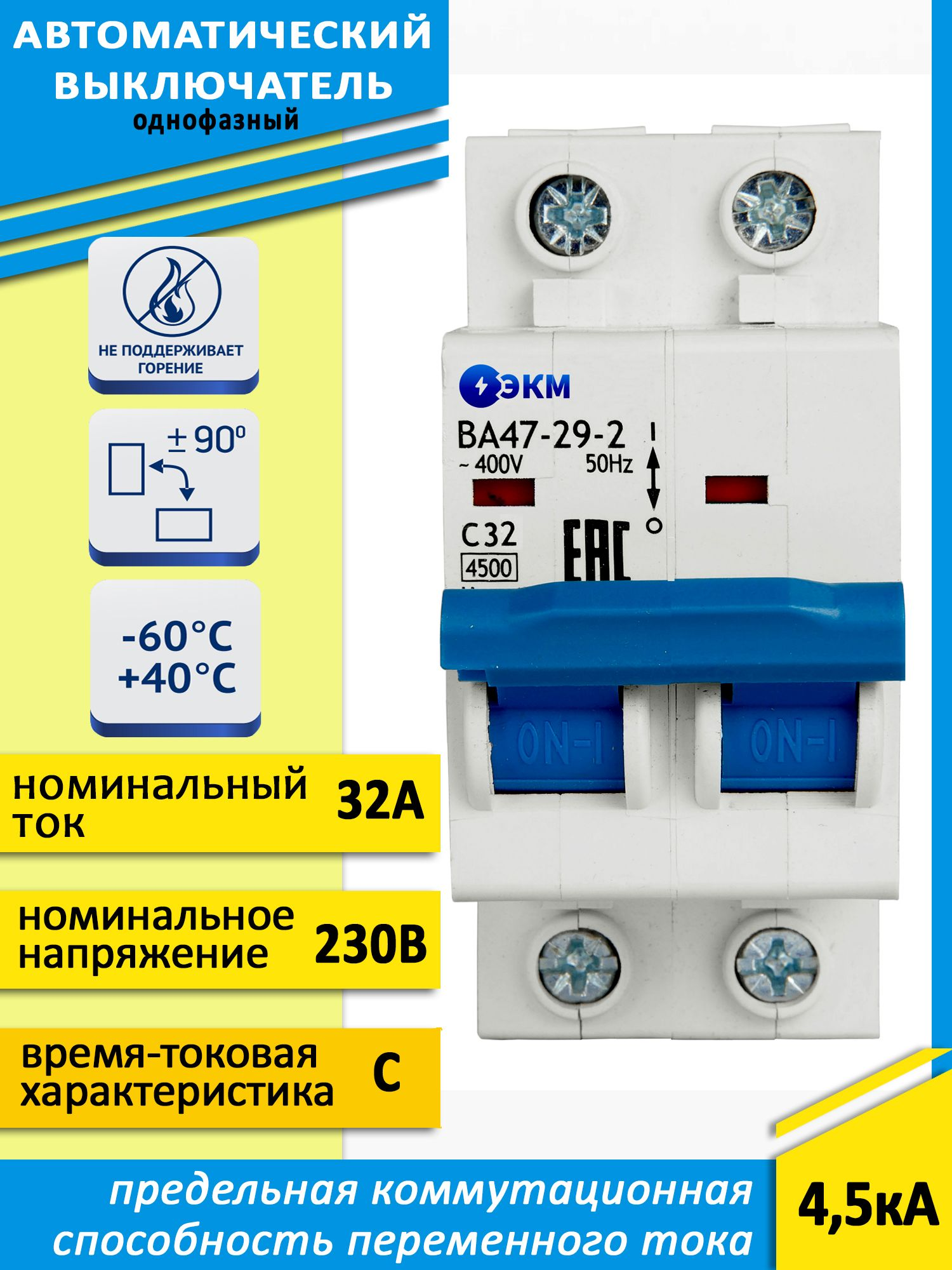 Завод ЭКМ представляет модульный автоматический однополюсный выключатель переменного тока с предельной коммутационной способностью при переменном токе 4.5 кА на номинальный ток 32А. Корпус выключателя выполнен из прочного пластика, обладающего стойкостью к воспламенению, степень защиты - IP 20. Время-токовая характеристика – С, порядок кратности номинальному току, при котором срабатывает расцепитель, 5-10*In. С такой характеристикой автоматы устанавливают в защите двигателя с не большими пусковыми токами, для освещения, в офисах, домах, квартирах, подсобных помещениях. Электрический пробка автомат 32ампер от производителя ЭКМ - это надежное устройство для обеспечения безопасности и стабильного электроснабжения в вашем доме. Этот однофазный автомат является эталоном качества, предоставляя надежную защиту от перегрузок и короткого замыкания.