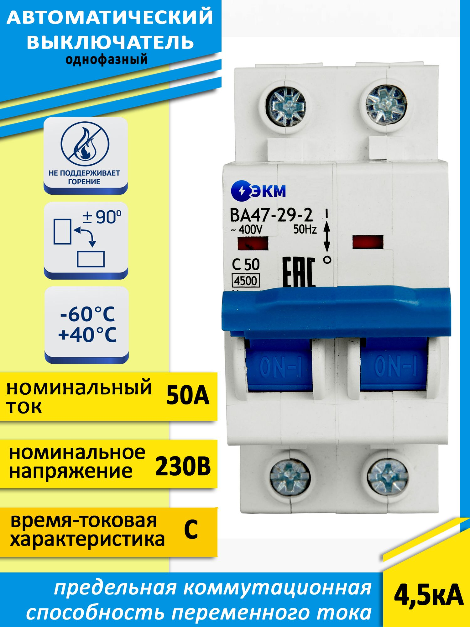 Завод ЭКМ представляет модульный автоматический однополюсный выключатель переменного тока с предельной коммутационной способностью при переменном токе 4.5 кА на номинальный ток 50А. Корпус выключателя выполнен из прочного пластика, обладающего стойкостью к воспламенению, степень защиты - IP 20. Время-токовая характеристика – С, порядок кратности номинальному току, при котором срабатывает расцепитель, 5-10*In. С такой характеристикой автоматы устанавливают в защите двигателя с не большими пусковыми токами, для освещения, в офисах, домах, квартирах, подсобных помещениях. Электрический пробка автомат 50ампер от производителя ЭКМ - это надежное устройство для обеспечения безопасности и стабильного электроснабжения в вашем доме. Этот однофазный автомат является эталоном качества, предоставляя надежную защиту от перегрузок и короткого замыкания.