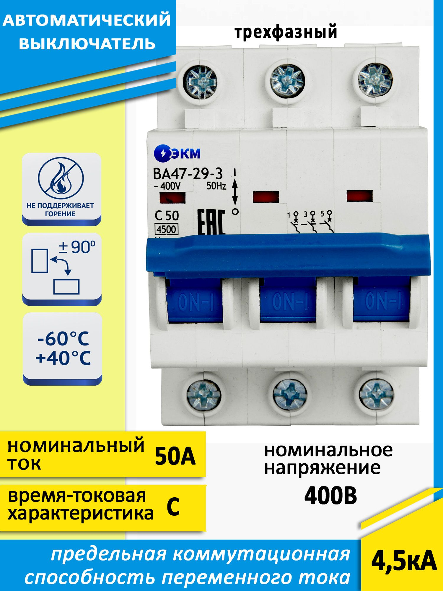 Завод ЭКМ представляет модульный автоматический трехполюсный выключатель переменного тока с предельной коммутационной способностью при переменном токе 4.5 кА на номинальный ток 50А. Корпус выключателя выполнен из прочного пластика, обладающего стойкостью к воспламенению, степень защиты - IP 20. Время-токовая характеристика – С, порядок кратности номинальному току, при котором срабатывает расцепитель, 5-10*In. С такой характеристикой автоматы устанавливают в защите двигателя с не большими пусковыми токами, для освещения, в офисах, домах, квартирах, подсобных помещениях. Электрический пробка автомат 50ампер от производителя ЭКМ - это надежное устройство для обеспечения безопасности и стабильного электроснабжения в вашем доме. Этот однофазный автомат является эталоном качества, предоставляя надежную защиту от перегрузок и короткого замыкания.