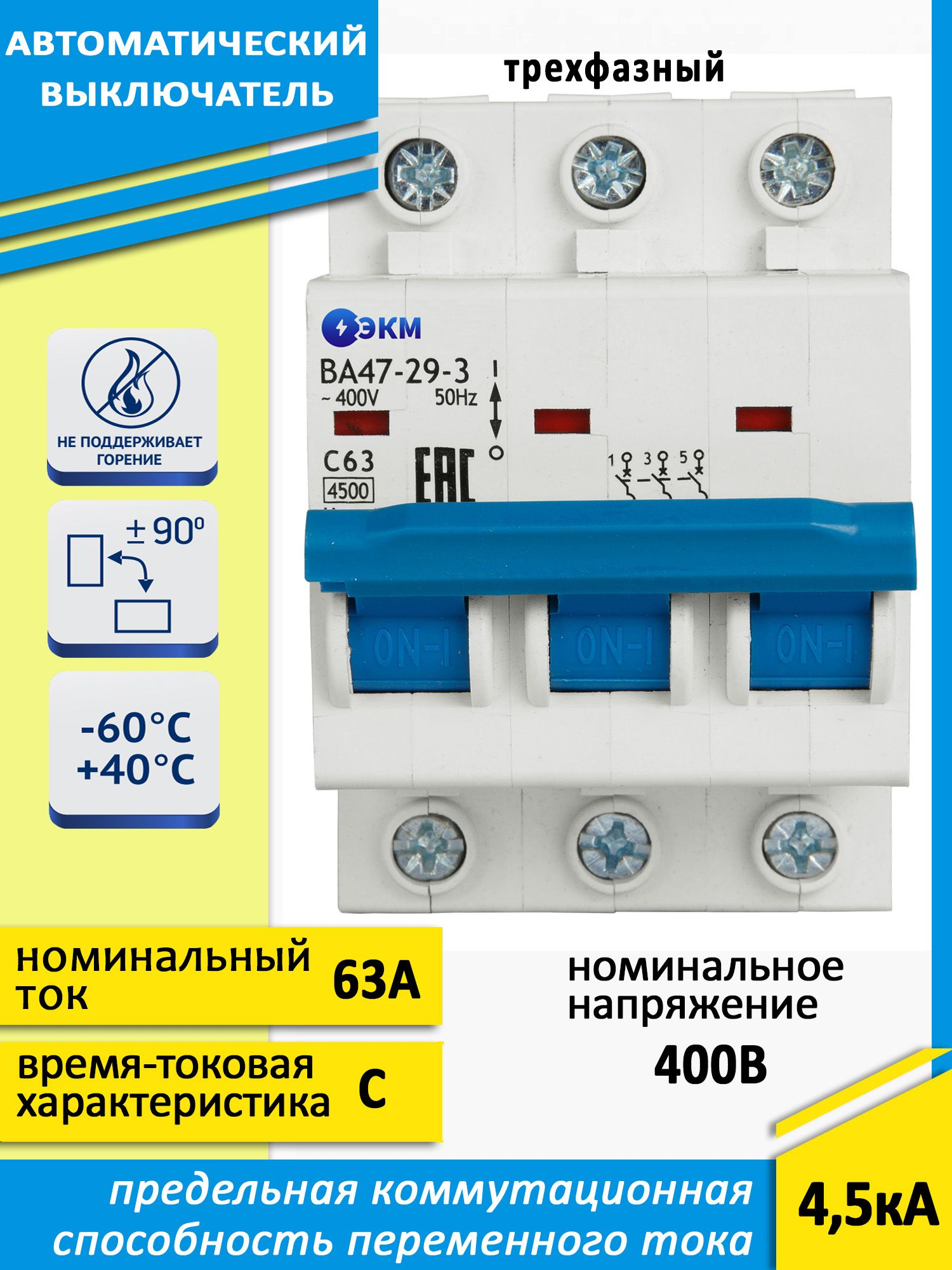 Завод ЭКМ представляет модульный автоматический трехполюсный выключатель переменного тока с предельной коммутационной способностью при переменном токе 4.5 кА на номинальный ток 63А. Корпус выключателя выполнен из прочного пластика, обладающего стойкостью к воспламенению, степень защиты - IP 20. Время-токовая характеристика – С, порядок кратности номинальному току, при котором срабатывает расцепитель, 5-10*In. С такой характеристикой автоматы устанавливают в защите двигателя с не большими пусковыми токами, для освещения, в офисах, домах, квартирах, подсобных помещениях. Электрический пробка автомат 63ампер от производителя ЭКМ - это надежное устройство для обеспечения безопасности и стабильного электроснабжения в вашем доме. Этот однофазный автомат является эталоном качества, предоставляя надежную защиту от перегрузок и короткого замыкания.