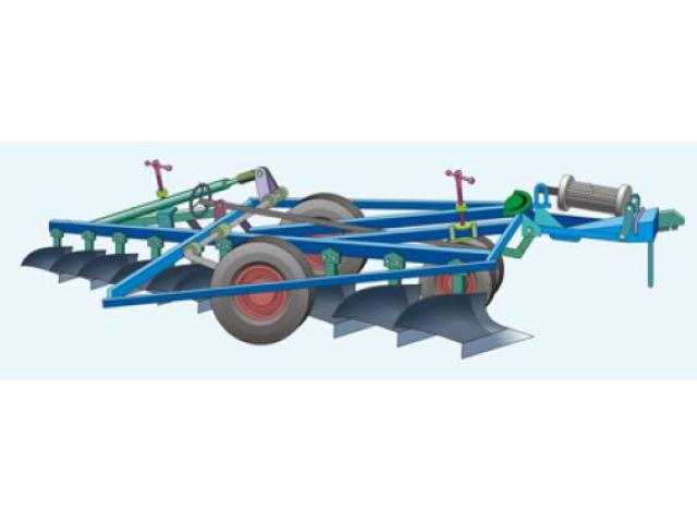 Основные узлы: шарнирная рама с двумя ходовыми пневматическими колесами, прицеп, плужные корпуса, опорные колеса, полевой механизм, гидравлический механизм подъема и приспособление для присоединения борон.